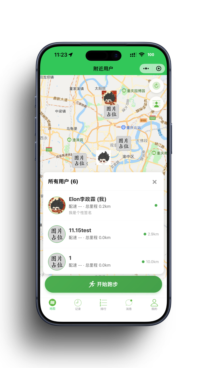 这是 RunMates 的核心引擎。当用户授权位置后,后端服务器会根据实时的经纬度坐标,通过严密的球面距离公式,毫秒级检索出你身边的跑者。